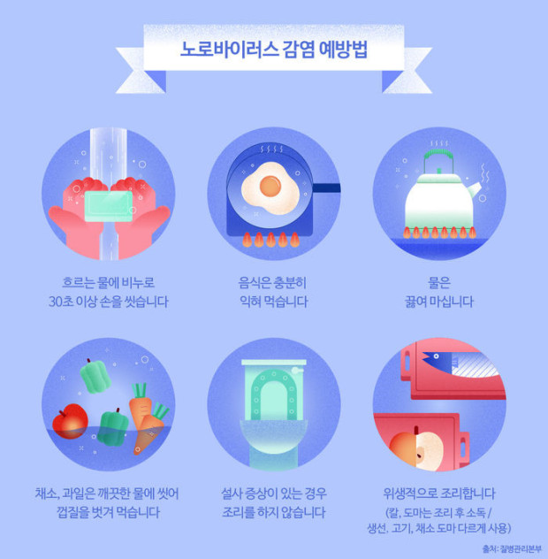 노로바이러스에 감염됐을 때 날 것의 해산물을 섭취하는 것은 금물이다. 특히 굴, 조개 등 어패류는 반드시 탕이나 구이 등 불에 완전히 익힌 후에 섭취하는 것이 좋겠다. 노로바이러스는 100도 이상의 끓는 물에서 소멸되는 것으로 알려져 있는 만큼 가열 섭취가 제일 중요하다.
