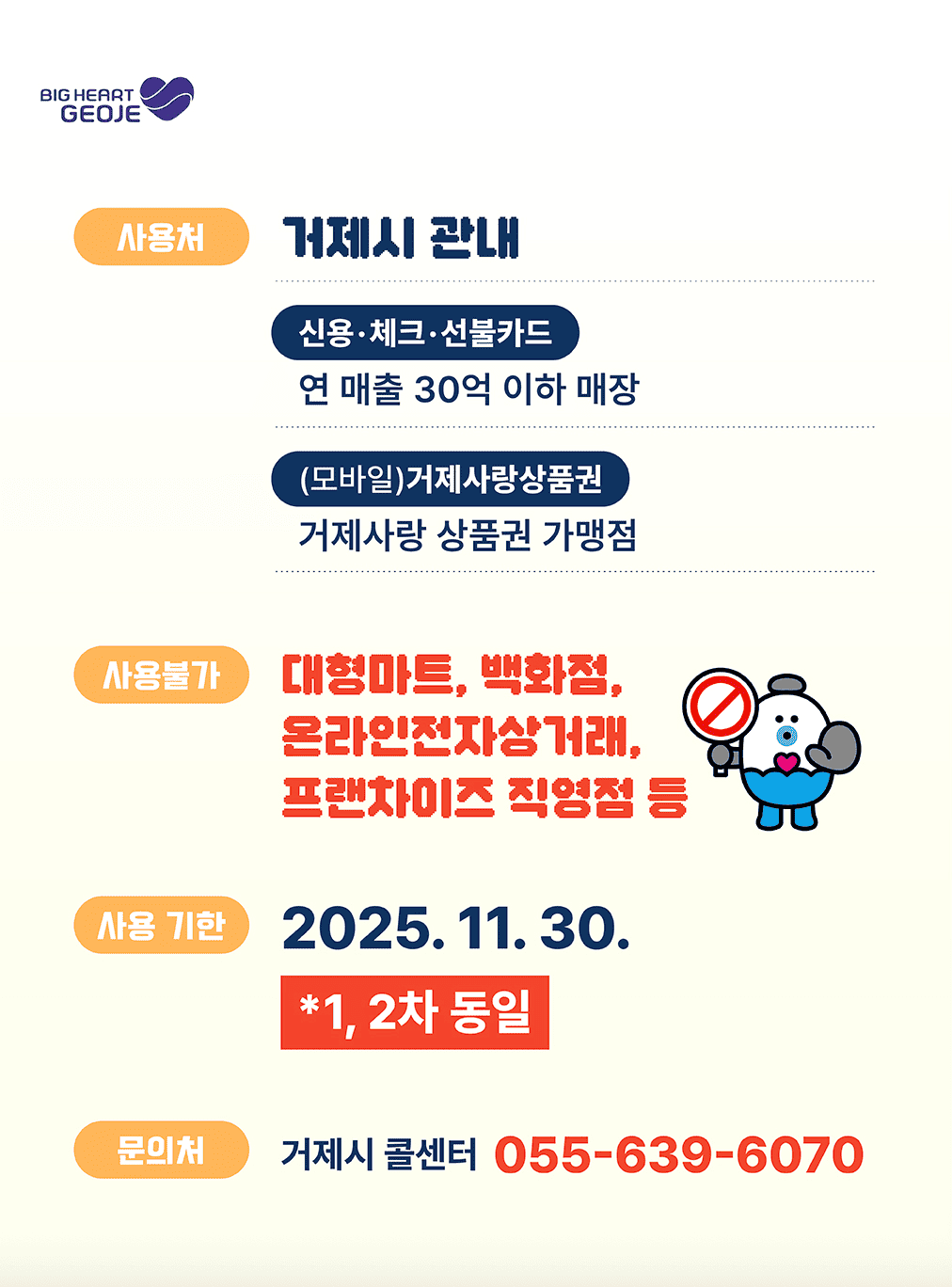 - 거제시 내 지정 상점(마트, 음식점 등)에서만 사용 가능