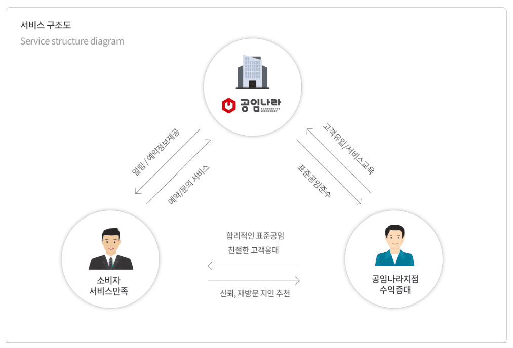 공임나라는 자동차 정비와 관련된 공임(=정비 인건비)을 투명하게 공개하고, 차량 소유자가 원하는 정비소에서 합리적인 가격에 서비스를 받을 수 있도록 연결해 주는 자동차 정비 중개 플랫폼이다. 전국의 제휴된 정비소 네트워크를 통해 표준화된 정비 서비스를 제공하며, 사용자는 정비소별 가격과 서비스 품질을 비교하여 최적의 선택을 할 수 있다.
