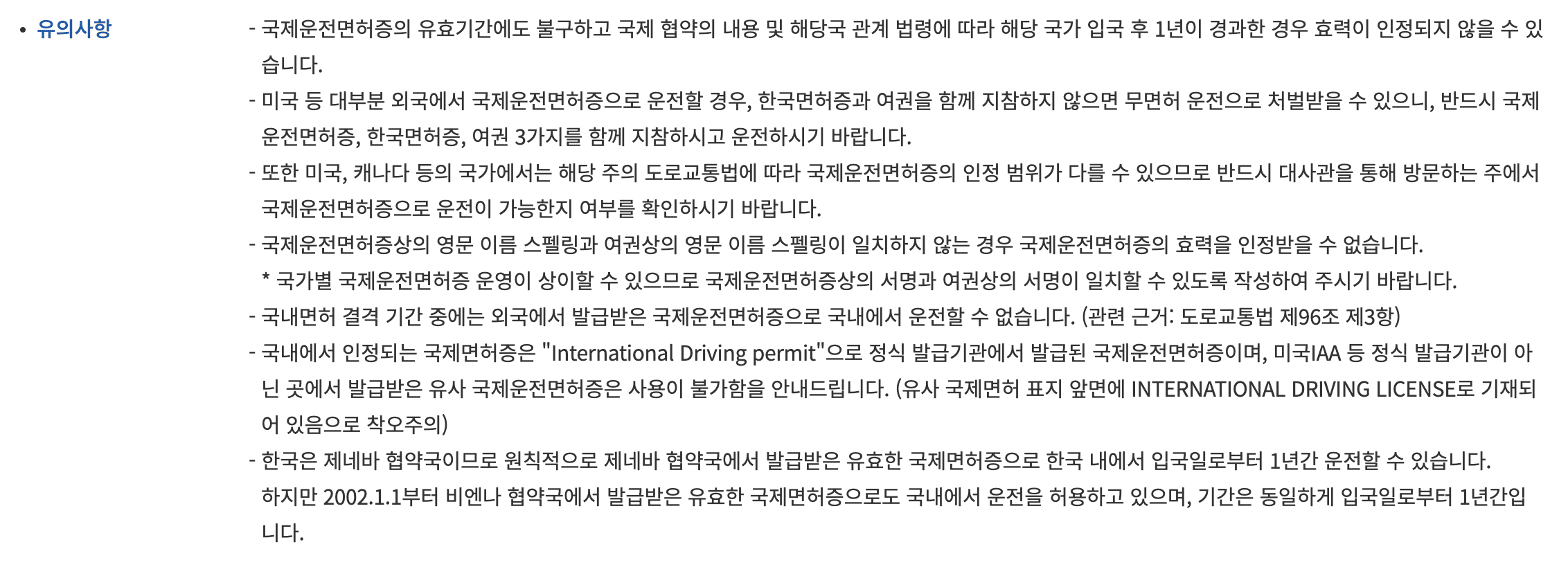- 국제 운전면허증은 단독으로 사용될 수 없으며, 반드시 원래 발급 국가의 운전면허증을 함께 소지해야 한다.
