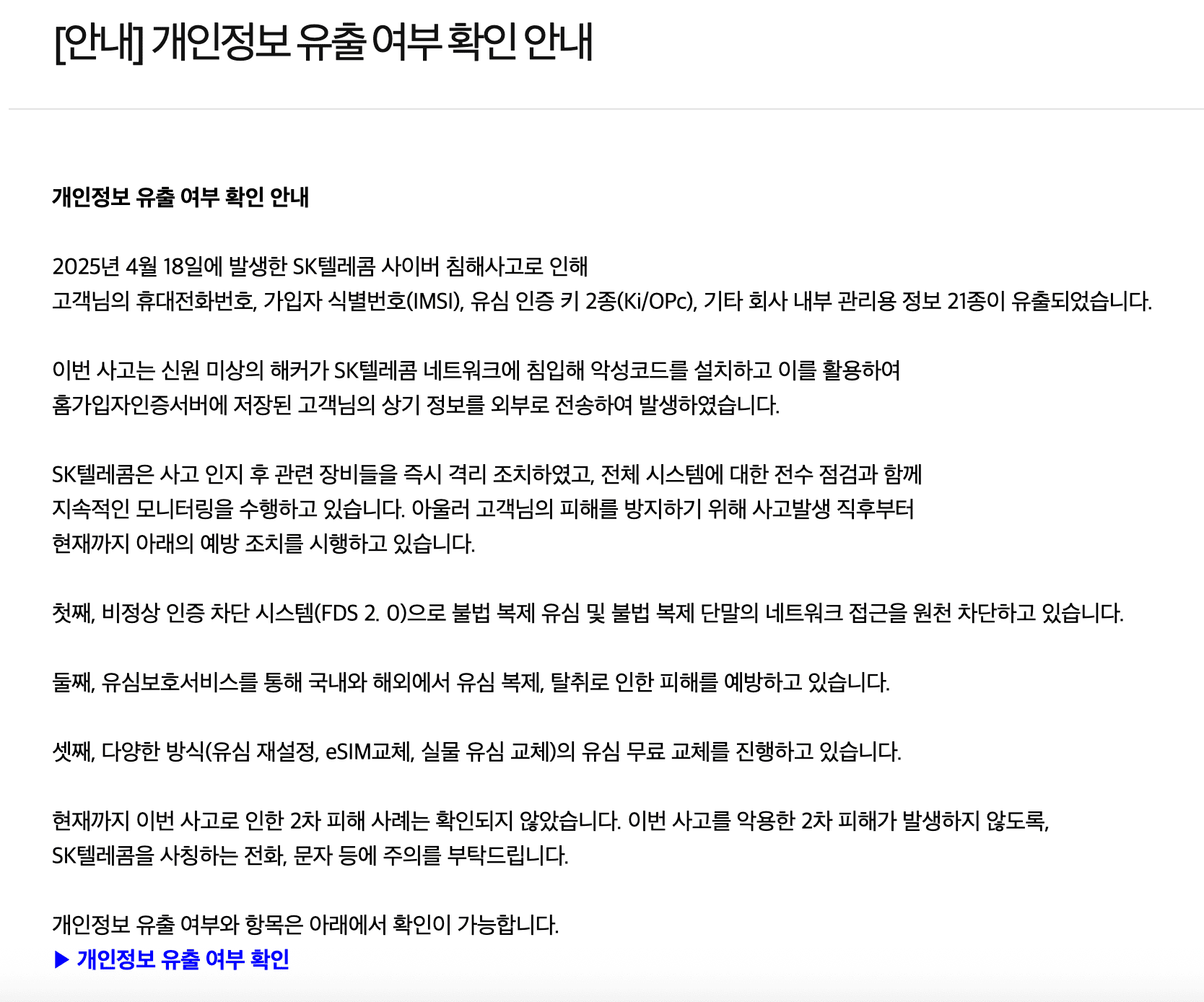 - 2025년 4월 18일 기준 SKT 내부 네트워크가 해킹되어 약 2,300만 명의 개인정보가 유출되었고,