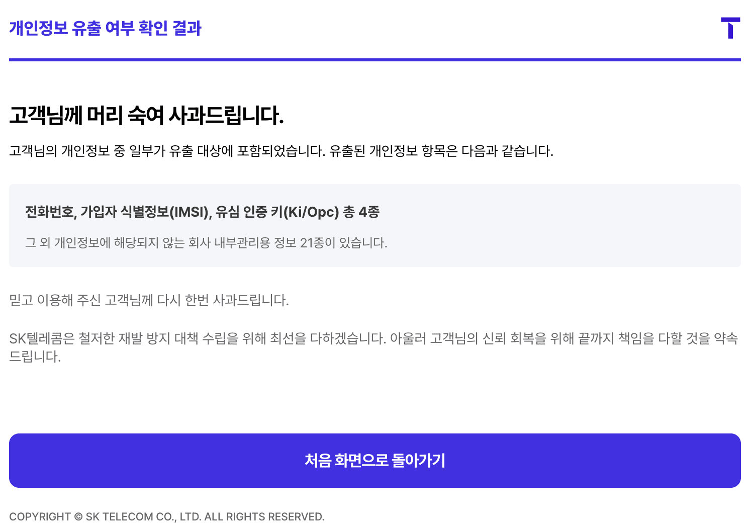 - 전화번호, 가입자 식별번호(IMSI), 유심 인증키 Ki/OPc, 그리고 내부 관리정보 포함 25종 항목 중 유출 여부 확인 가능