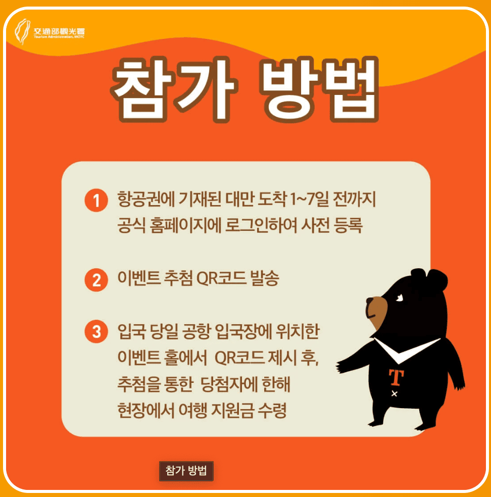 지원금을 받기 위해서는 사전 등록이 필수입니다. 등록 후 대만 도착 후 공항에서 현장 추첨을 통해 지급됩니다.