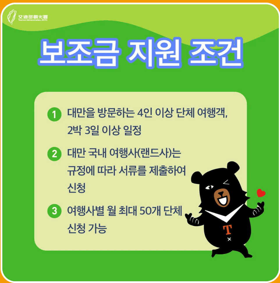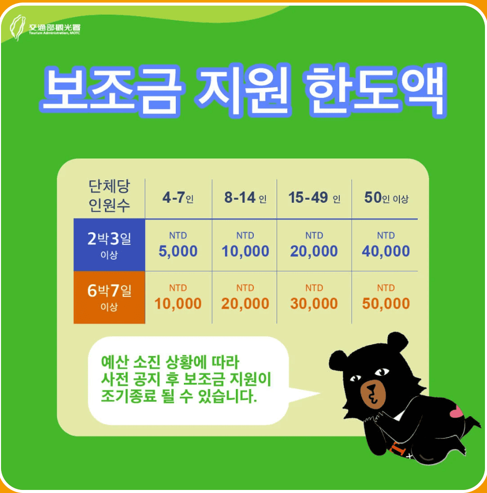 - 단체 여행객: 최대 50,000NTD 보조금 지급