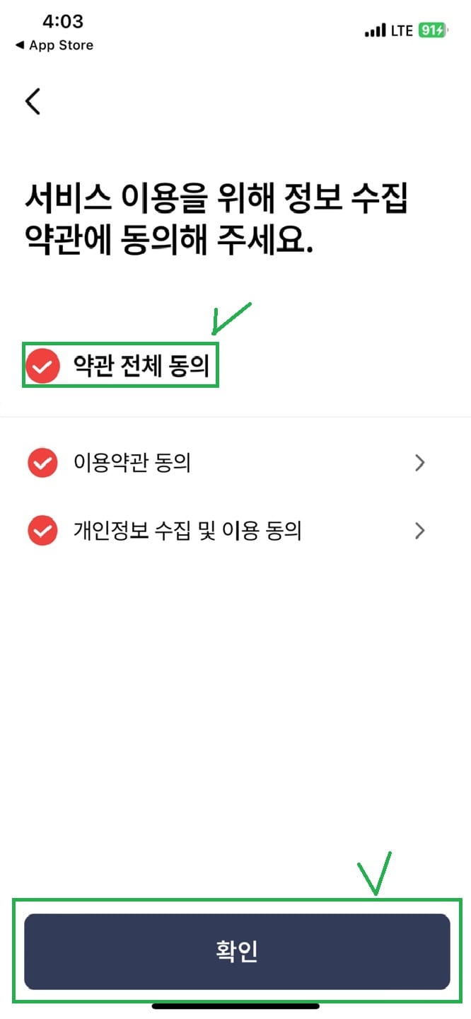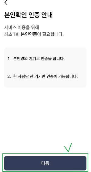 📌 '생체인증 로그인 등록 시 사용' 기능 접근 권한 안내를 '확인' 선택한다 -> 약관을 확인한 후 '약관 전체 동의'를 선택하고 '확인'버튼을 선택한다 -> "본인확인 하기" 선택한다