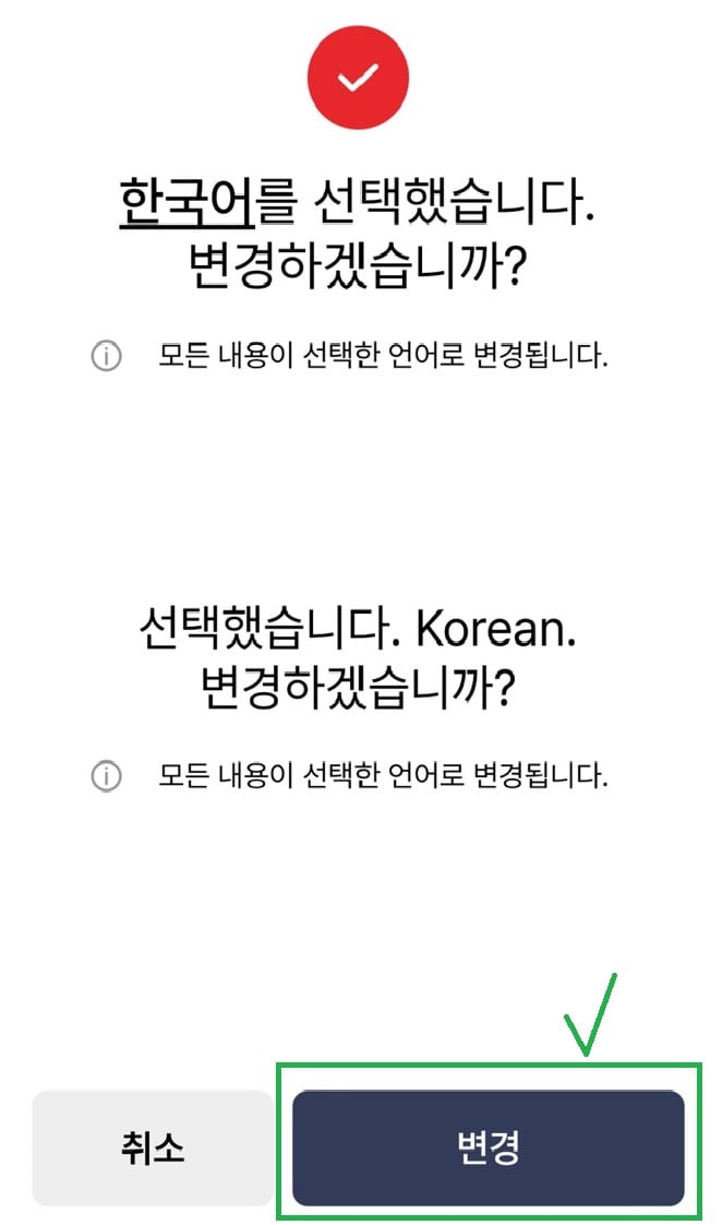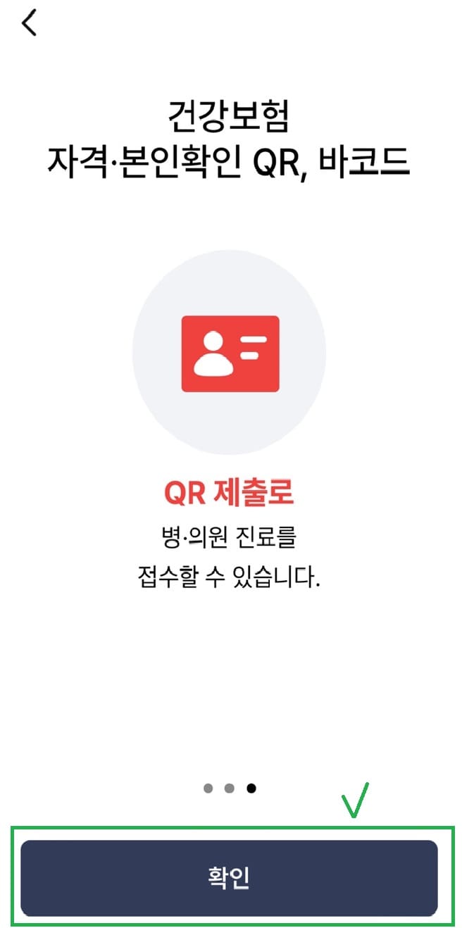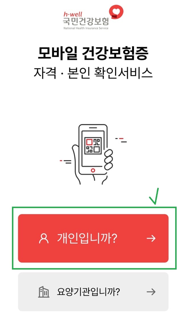 📌 화면에 표시된 "개인"을 선택한다 -> 언어를 "한국어"로 선택한다 -> 건강보험 자격/본인확인 QR, 바코드 문구가 나오면 확인 버튼을 선택한다