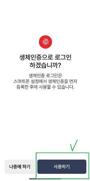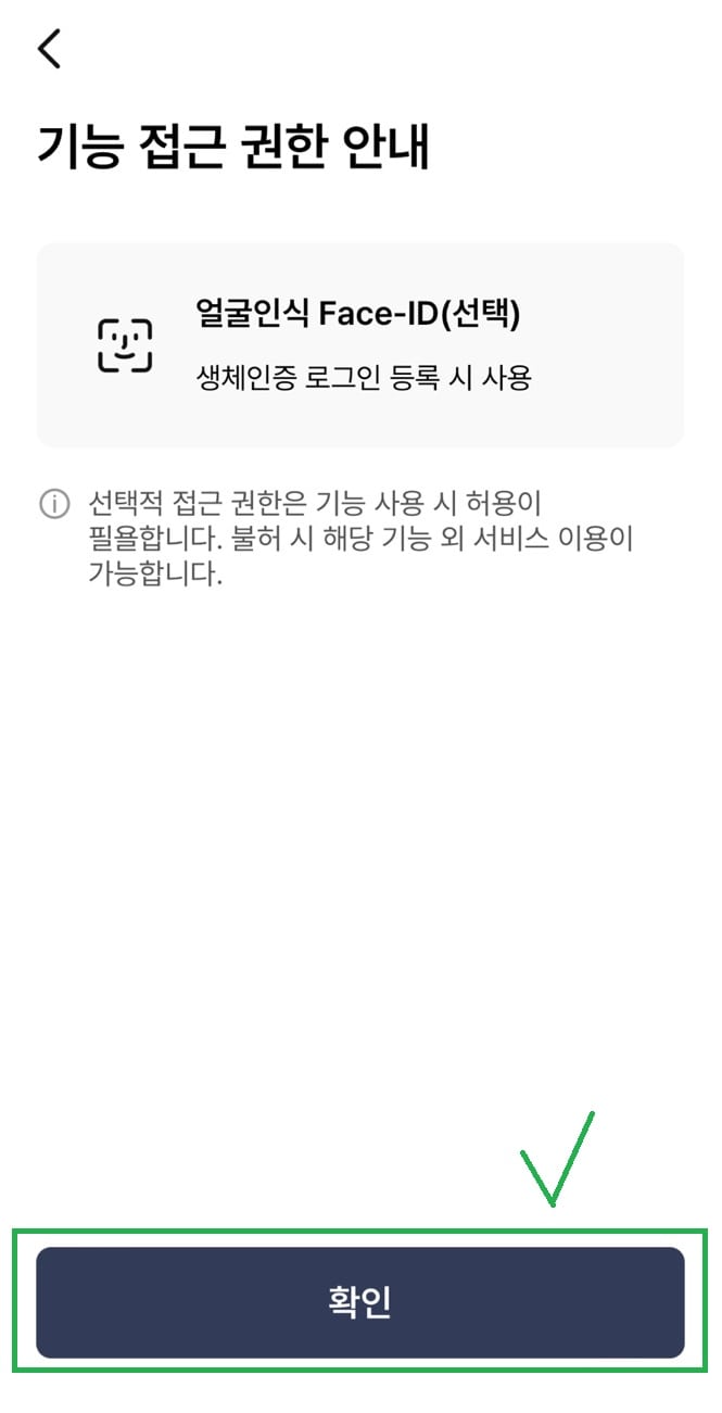 📌 '생체인증 로그인 등록 시 사용' 기능 접근 권한 안내를 '확인' 선택한다 -> 약관을 확인한 후 '약관 전체 동의'를 선택하고 '확인'버튼을 선택한다 -> "본인확인 하기" 선택한다