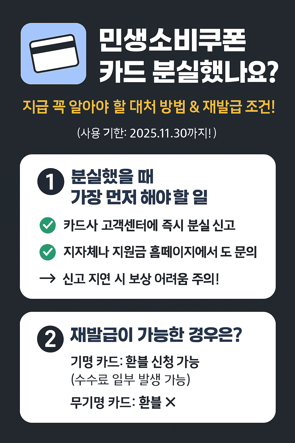 2025년 기준, 민생회복 소비쿠폰은 카드형(선불형/체크카드)으로 지급되는 경우가 많습니다. 하지만 카드를 분실했거나 도난당했을 때 어떻게 대처해야 할지 막막하셨죠?
