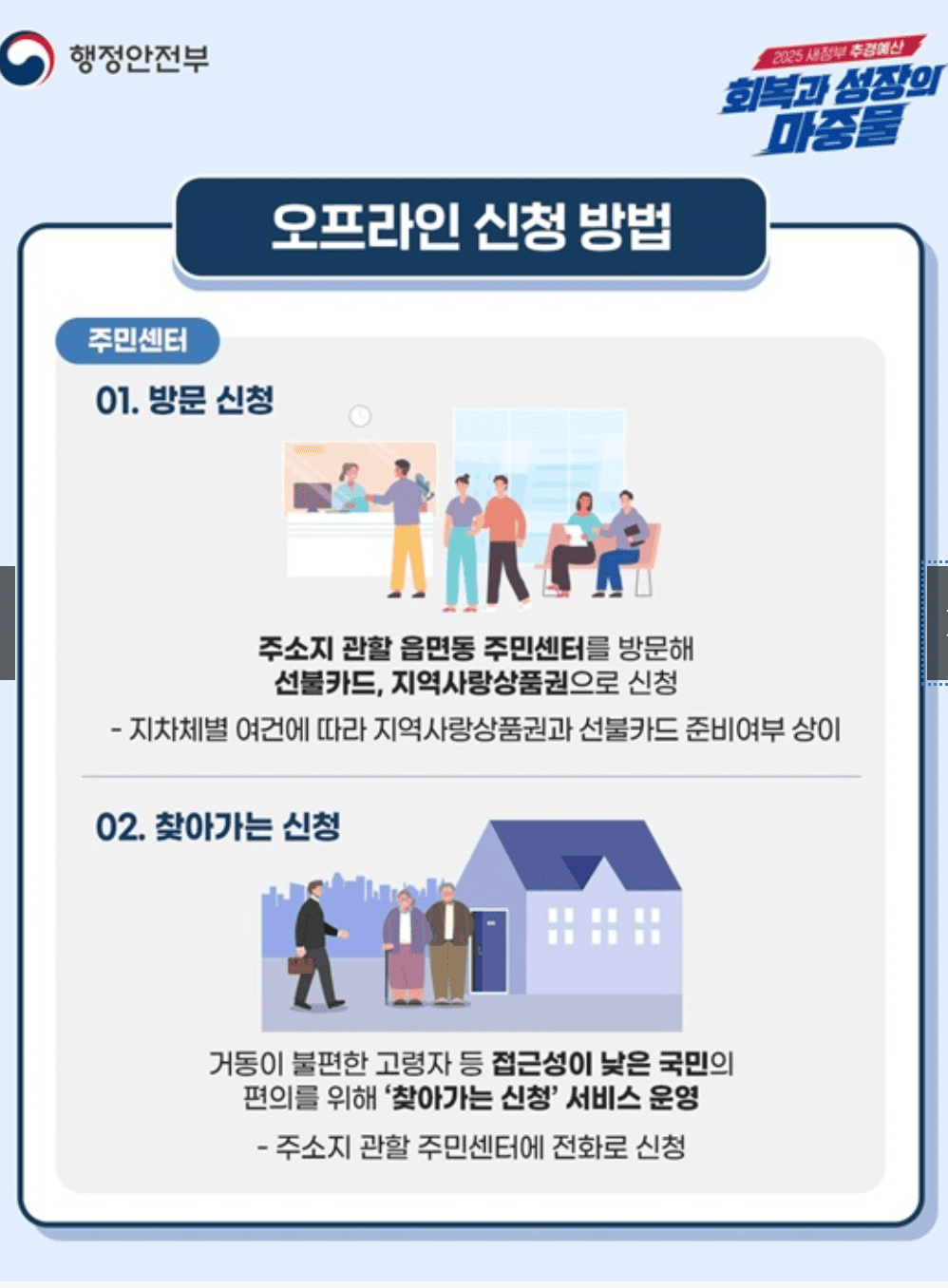 - 보호시설이나 단독세대주인 경우에도 주민센터 방문하여 신청할 수 있습니다.