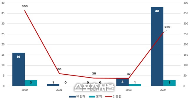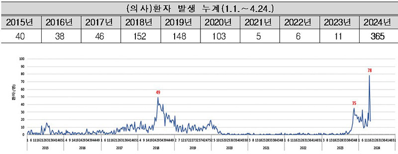 전 세계적으로 소아청소년 위주 백일해 환자수가 증가하여 10년 만에 백일해 환자가 최다 발생했다고 한다. 연령대별로는 12세 이하 어린이가 216명(59.2%)으로 가장 많았으며, 13~19세에서 92명(25.2%), 60세 이상 32명(8.8%) 순으로, 지역별로는 교육시설 중심으로 집단발생이 보고된 경남(182명, 49.9%), 경기(56명, 15.3%) 부산(47명, 12.9%) 순으로 많이 발생했다. 전 세계적으로 아동청소년 위주 백일해가 유행하고 있는 추세인만큼 유행 상황을 면밀히 살펴야 한다.