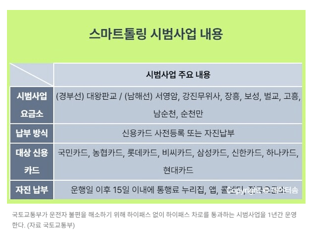 | 하이패스 이용자 | 기존 하이패스 유지 | • 현재 사용 중인 하이패스 그대로 유지하면 자동으로 스마트톨링 시스템과 연동되어 이용가능(별도의 신청이나 절차 없이 자동 연동됨). • 하이패스 카드 및 계좌 정보는 그대로 유지되며, 통행료는 기존과 동일한 방식으로 자동 청구 |