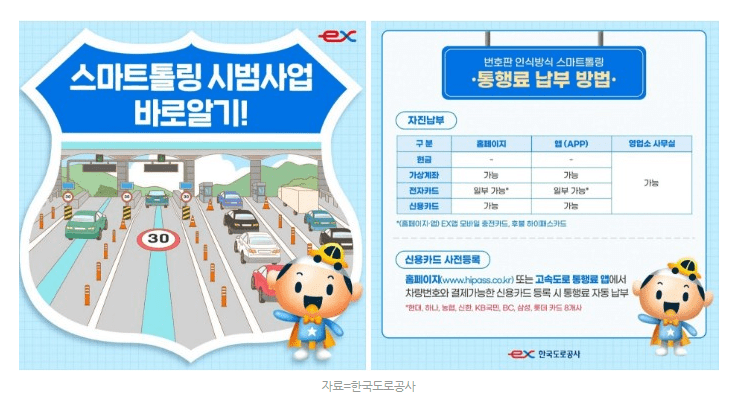 | 하이패스 해지 후 신용카드 사전등록 | • 기존의 하이패스 해지하고 신용카드 사전 등록하면 이용 가능 • 국토교통부 차량정보포털 또는 스마트톨링 어플에서 차량정보와 신용카드 정보 등록 • 신용카드로 자동 청구됨 |