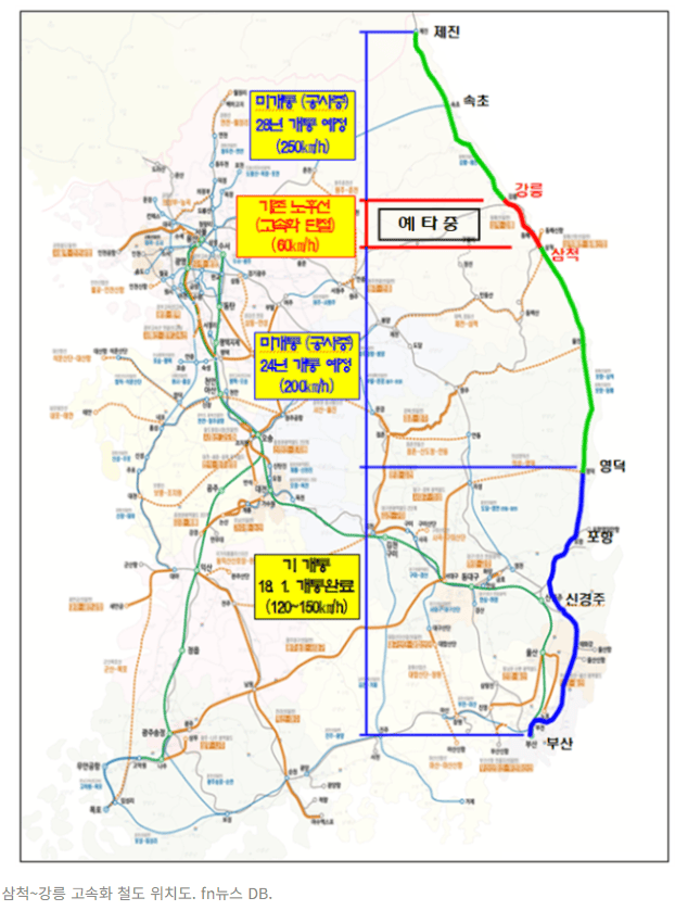 - 여기에 강릉~고성 제진을 잇는 동해북부선이 향후 개통되면 강릉을 중심으로 한 영동권과 부산·대구를 중심으로 한 영남권이 통합 생활권이 된다.
