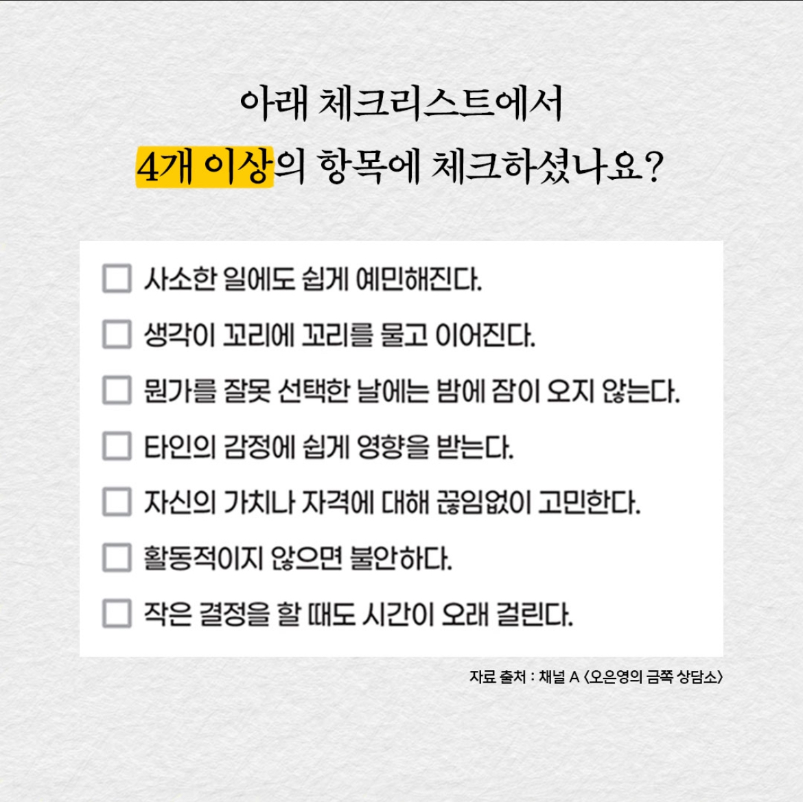 따라서 이 증후군을 보이는 사람들이 병리학적으로 치료의 대상이 되어야 하는 것은 아니지만 “내가 예민한가?” 시종일관 물음을 달고 사는 이들에게, 그것은 누구에게나 일어날 수 있는 일이며 생각보다 주변에 그런 특징을 가진 사람이 꽤 많다는 것을 알려주기 위한 것일 뿐이니 아래의 체크리스트로 긴가민가하다면 조금 더 두드러지는 PESM의 특징으로 판별해 보기를 바란다.