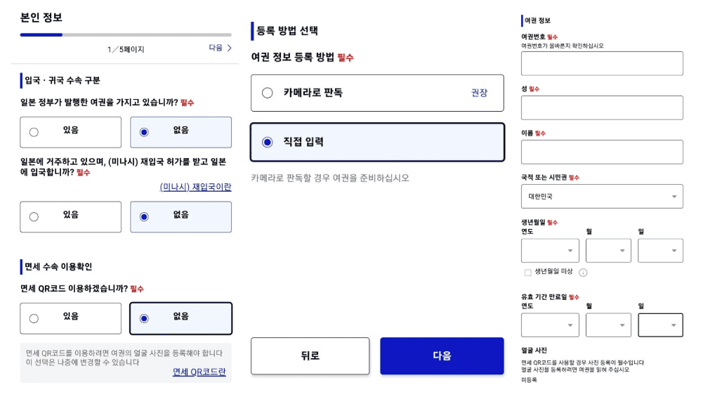 - 여권상의 영문 이름, 여권 번호, 국적 입력