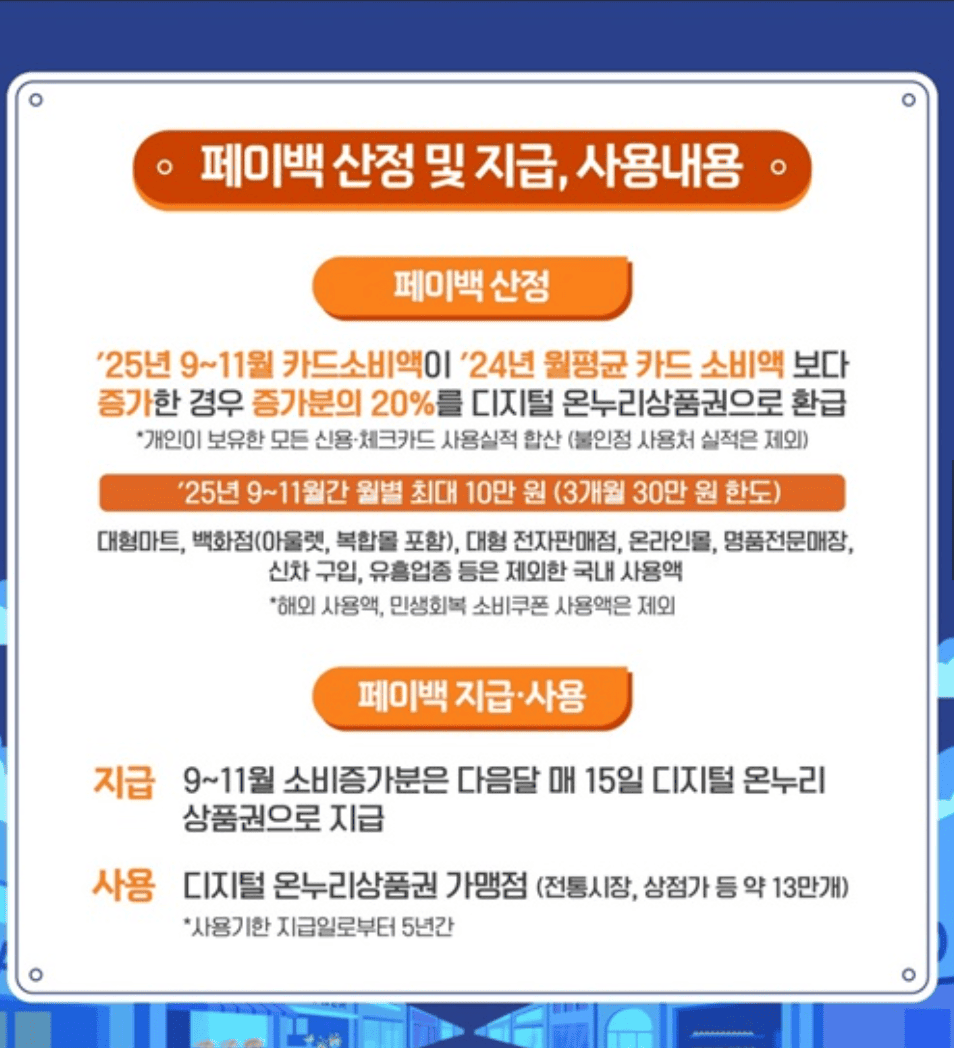 예를 들어, 2024년 월평균 카드 사용액이 200만 원이었고, 2025년 10월에 250만 원을 사용했다면 증가액은 50만 원 → 이 중 20%인 10만 원을 페이백 받을 수 있습니다.