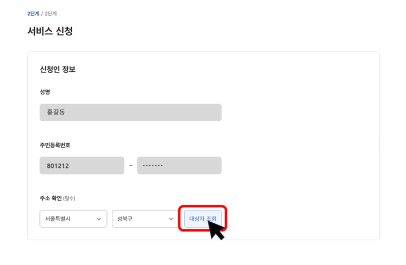 - 주민등록 상 거주지 주소를 선택하신 후 대상자 조회를 클릭합니다.