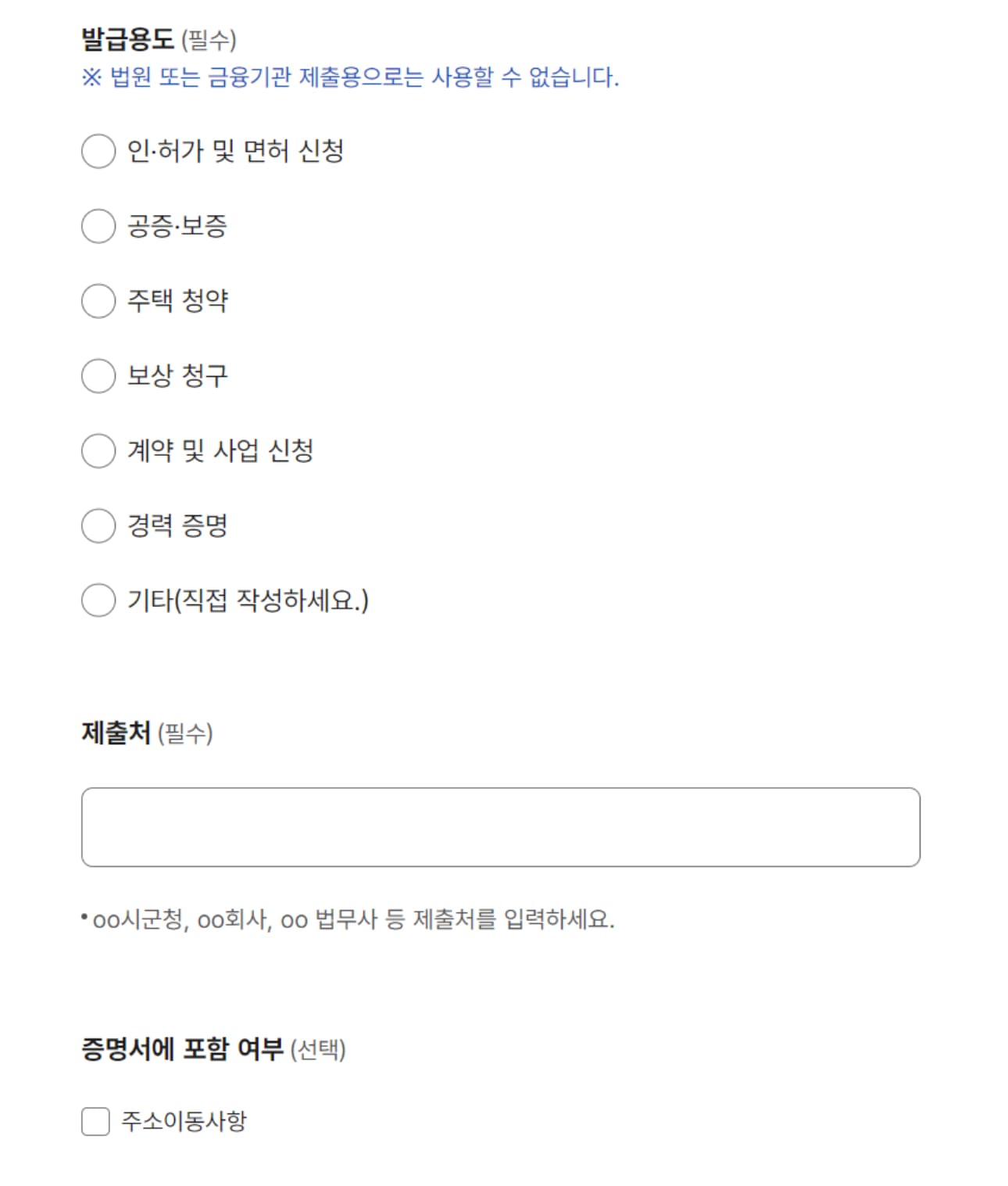 - 법원 또는 금융기관 제출용으로는 사용하실 수 없으니 발급 전 사용 목적을 반드시 확인하세요.