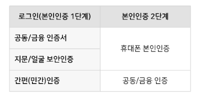 | 본인 인증 | 공동인증서, 금융인증서 | 신분증 지참 |