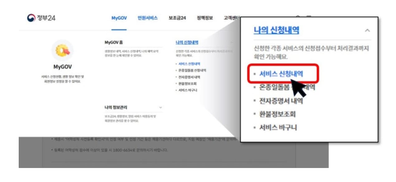 - 상단 메뉴에서 'MyGOV > 나의 신청내역 > 서비스 신청내역'을 선택합니다.