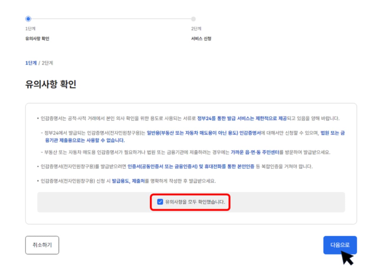 - 유의사항 확인이 완료되었다면 체크를 하신 후, '다음'으로 버튼을 클릭합니다.