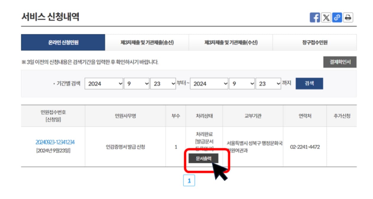 - 리스트에서 신청하신 내역을 확인하신 후 '출력'을 클릭하시면 증명서를 출력하실 수 있습니다.