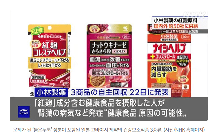 최근 일본에서 고바야시 제약이 제조·판매한 '홍국'(붉은누룩)'홍국'(붉은 누룩) 성분이 함유된 건강보조식품을 섭취한 일부가 신장 질환에 걸린 것으로 나타난 가운데, 한 명이 사망했다고 제약회사 측이 밝혔다.
