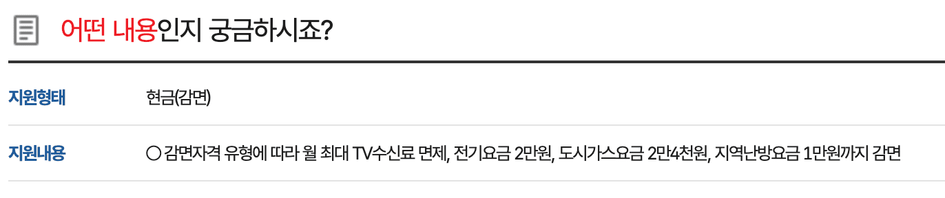 👉 위 대상자에 해당된다면 전기요금 감면, 가스요금 감면, TV수신료 면제가 가능합니다.