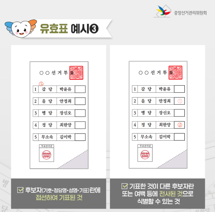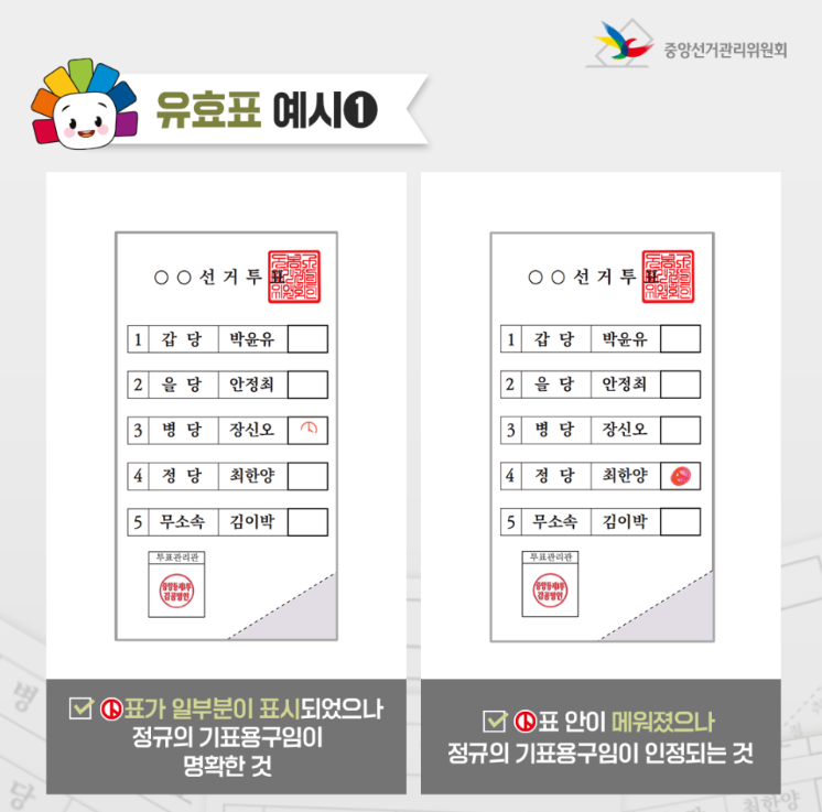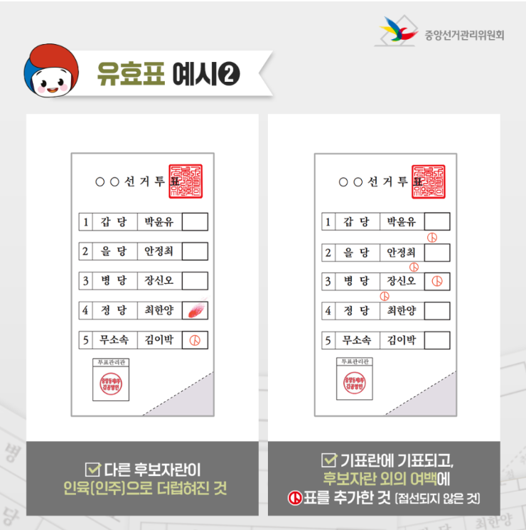 기표를 하다보면 긴장된 탓에 인주가 번지거나 명확하게 찍히지 않는 경우도 더러 발생하는데 그럴 경우 당황하지 말고 아래의 경우를 살펴보며 편안한 마음으로 한표 행사하자.
