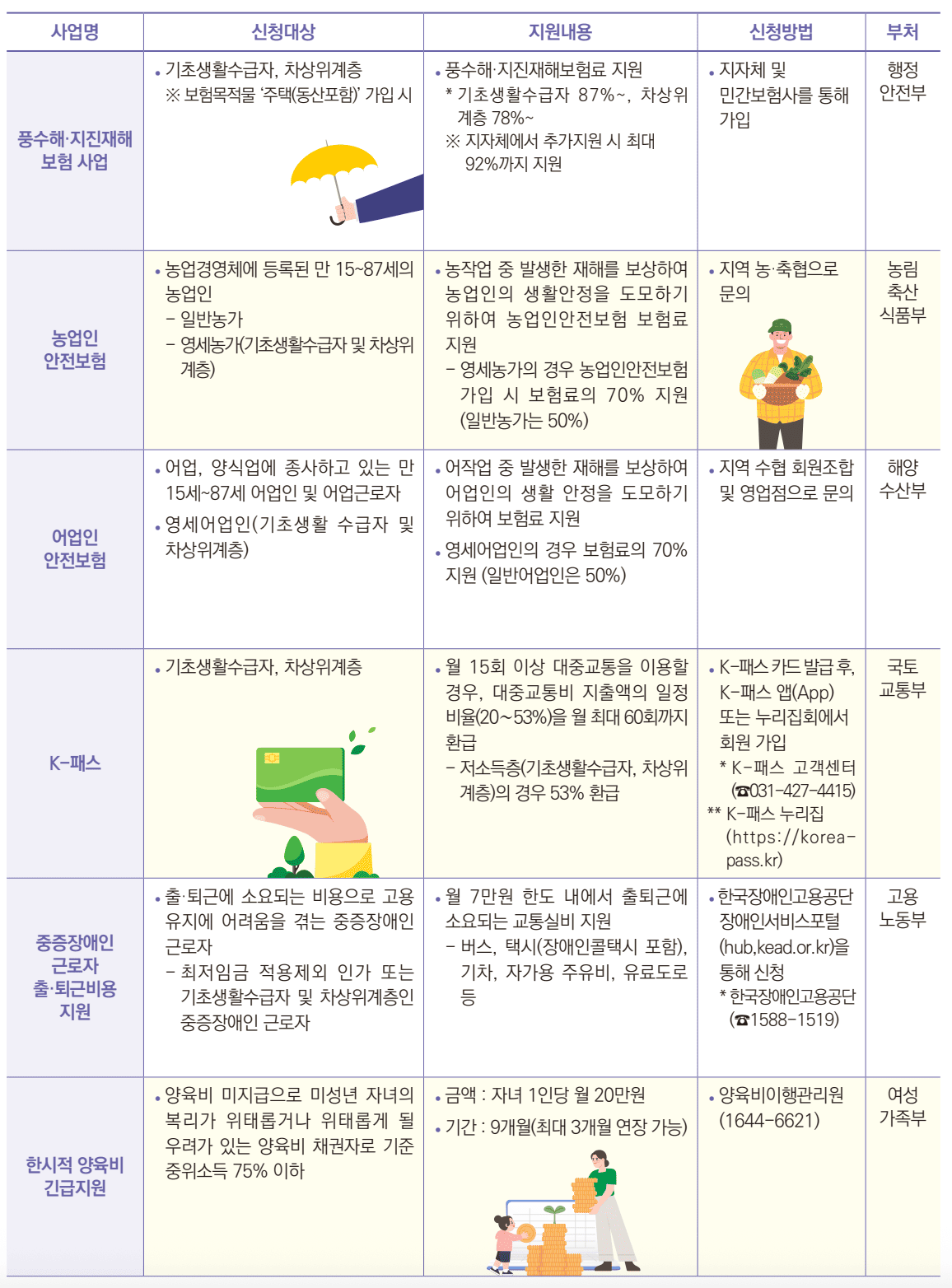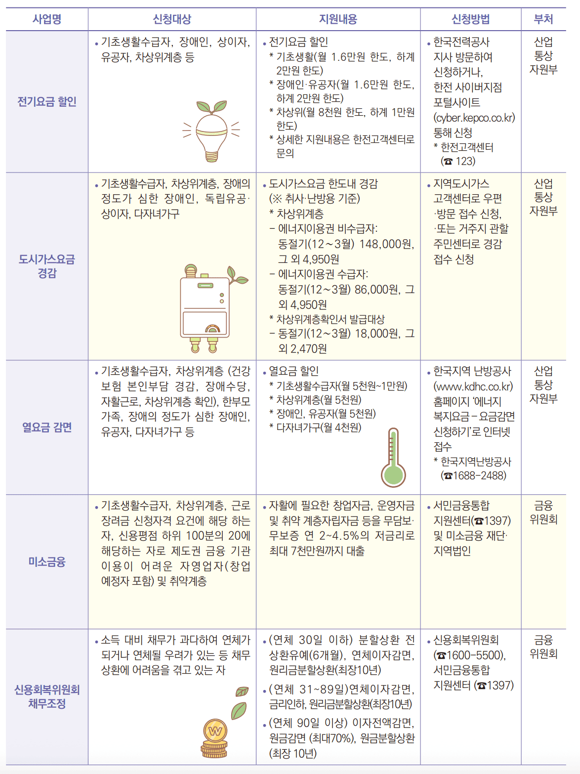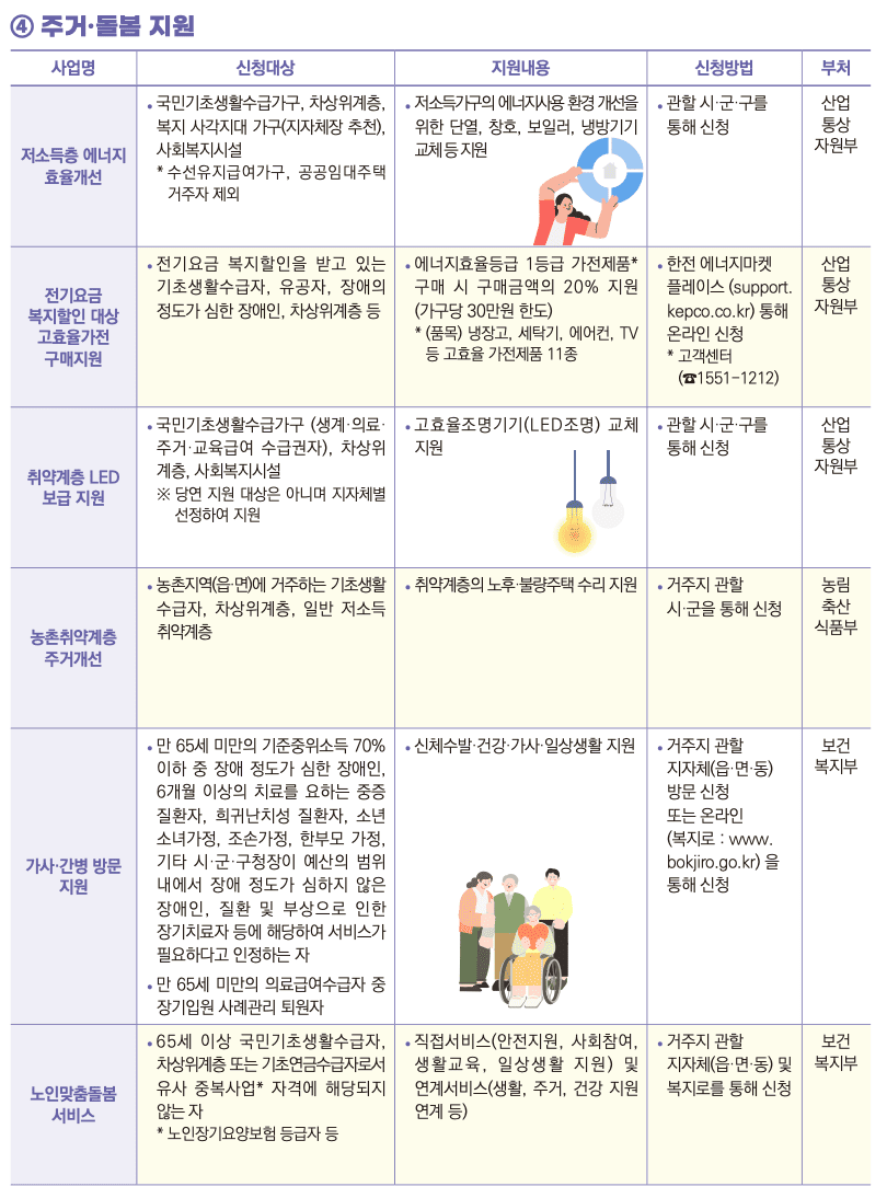 - 에너지효율 개선, 긴급돌봄 서비스, 아이돌봄 지원