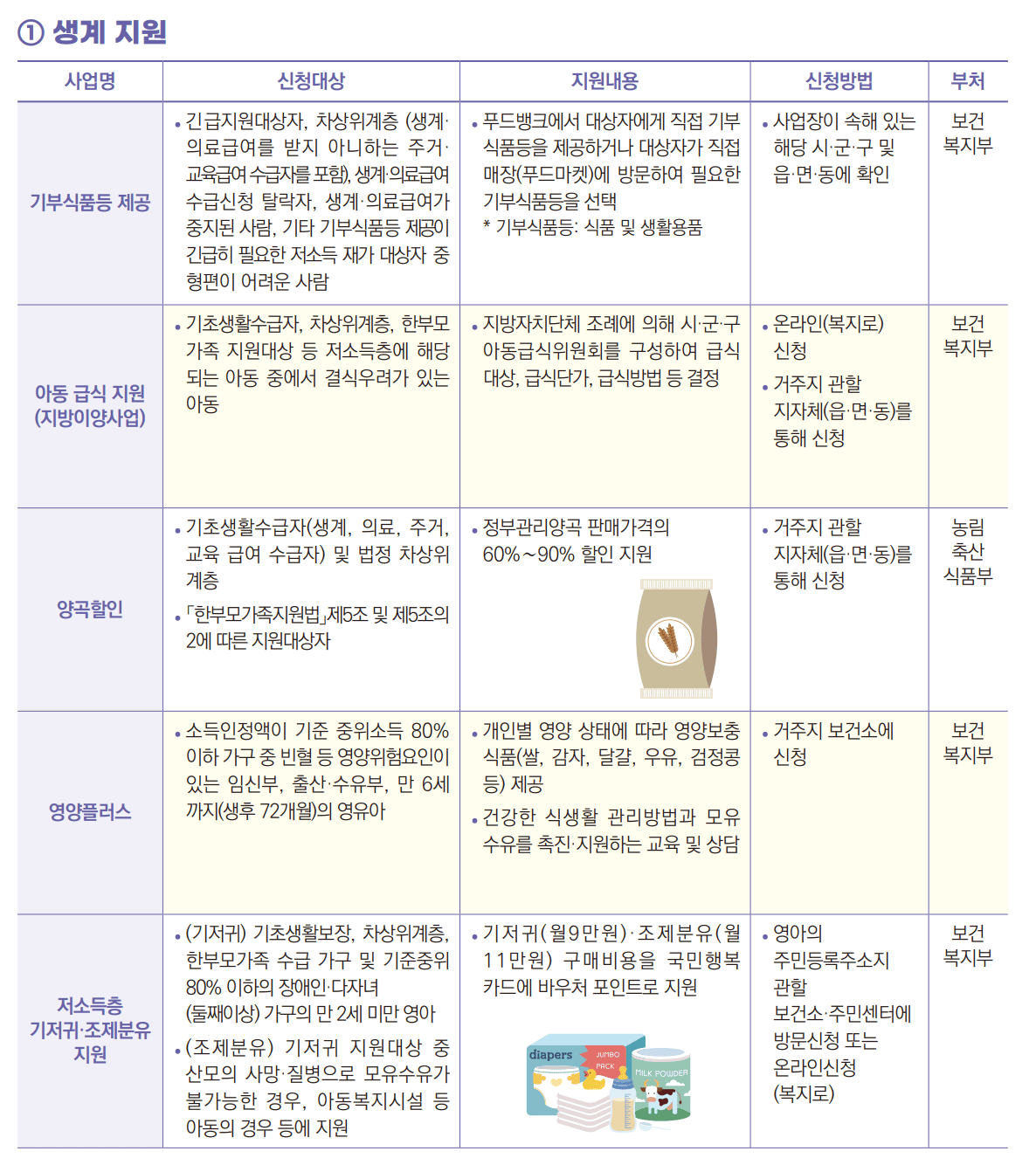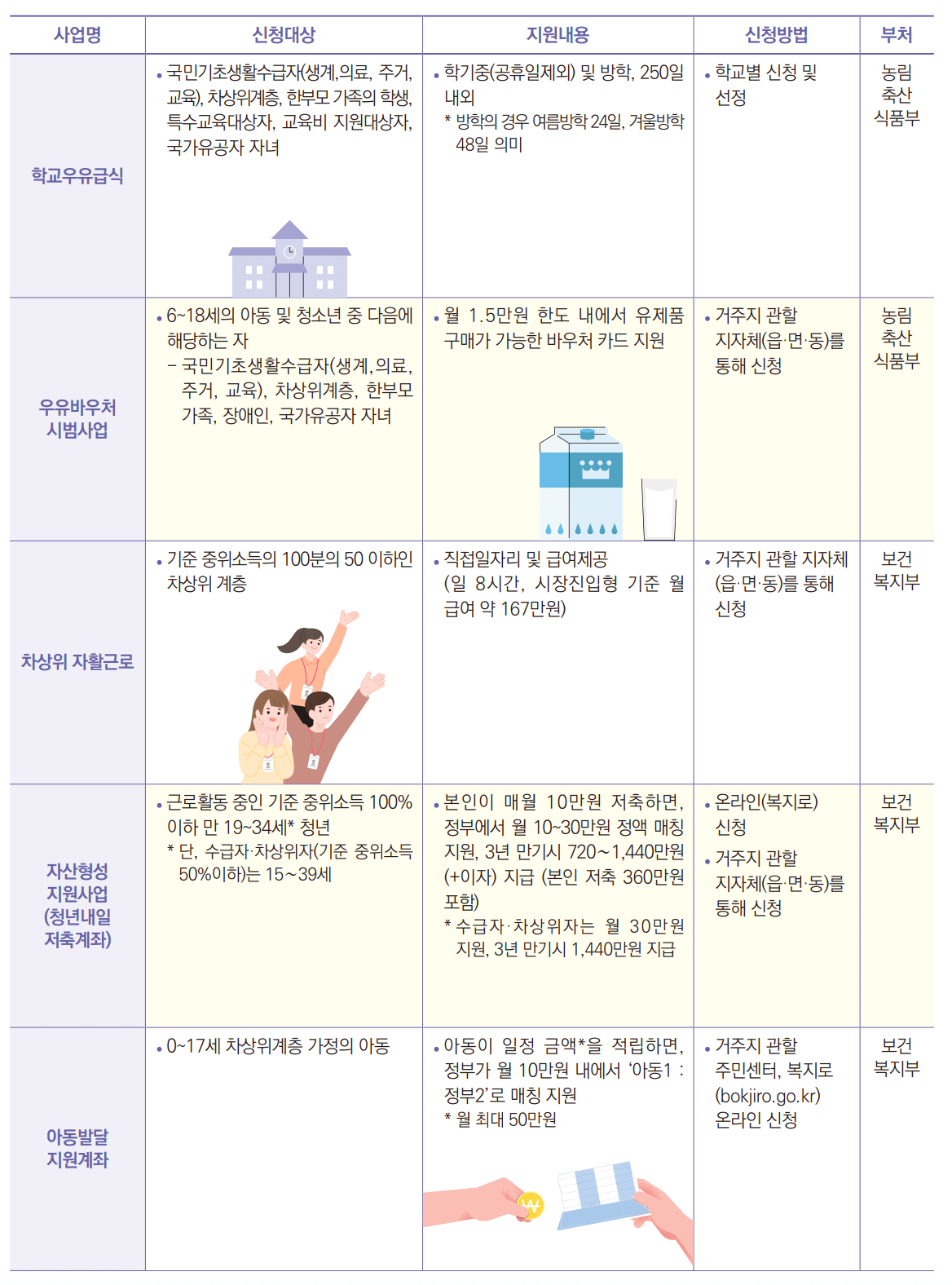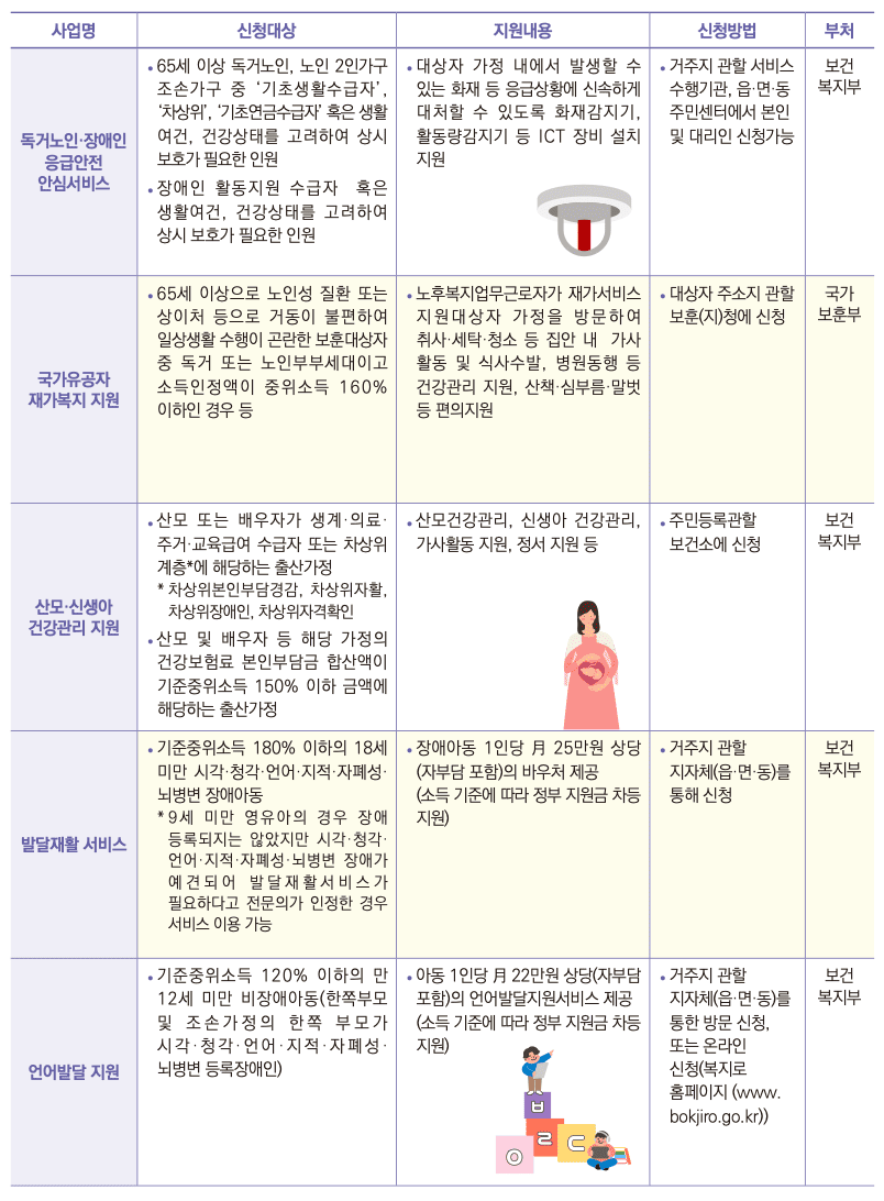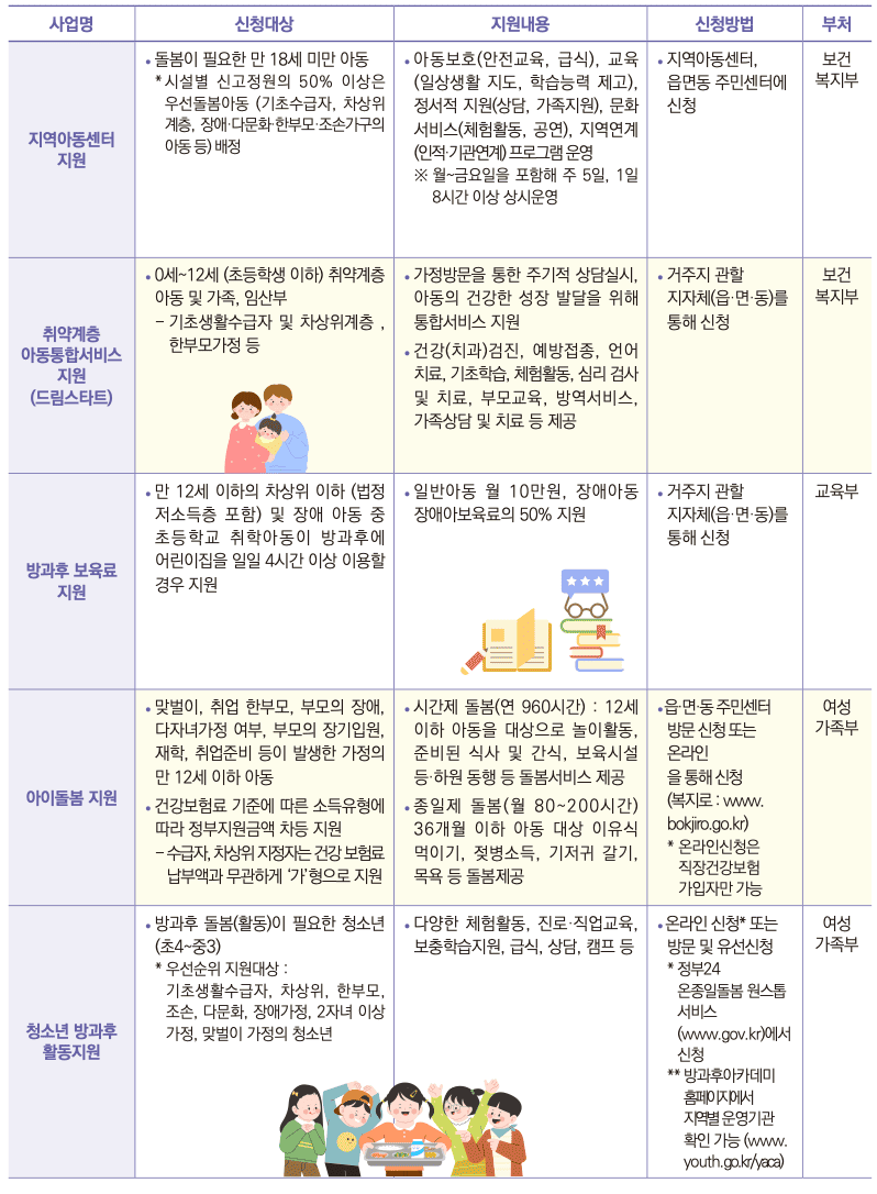 - 에너지효율 개선, 긴급돌봄 서비스, 아이돌봄 지원