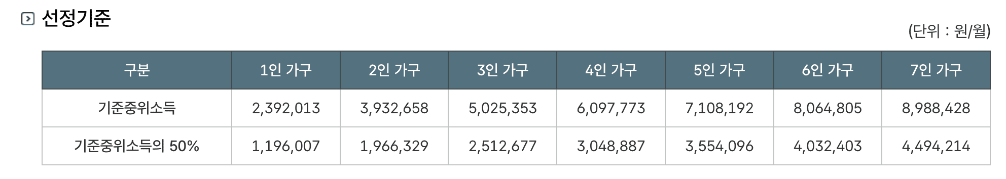 | 중위소득 | 2,392,013 | 3,932,658 | 5,025,353 | 6,097,773 |
