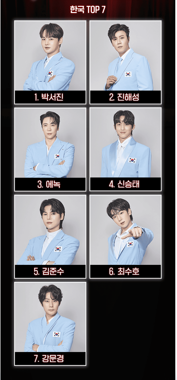 국민 MC 신동엽을 필두로 설운도, 윤명선, 린, 대성, 강남이 한국 마스터로 출연하며, 박서진, 진해성, 에녹 등 이미 큰 인기를 얻은 가수들이