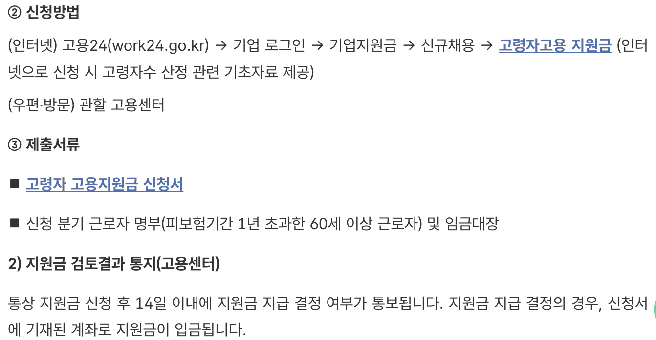 특히 60세 이상 근로자에게 정년 연장, 재고용 또는 계속고용제도를 적용하는 기업이라면 분기당 30만원, 최대 2년 동안 안정적인 지원을 받을 수 있습니다.