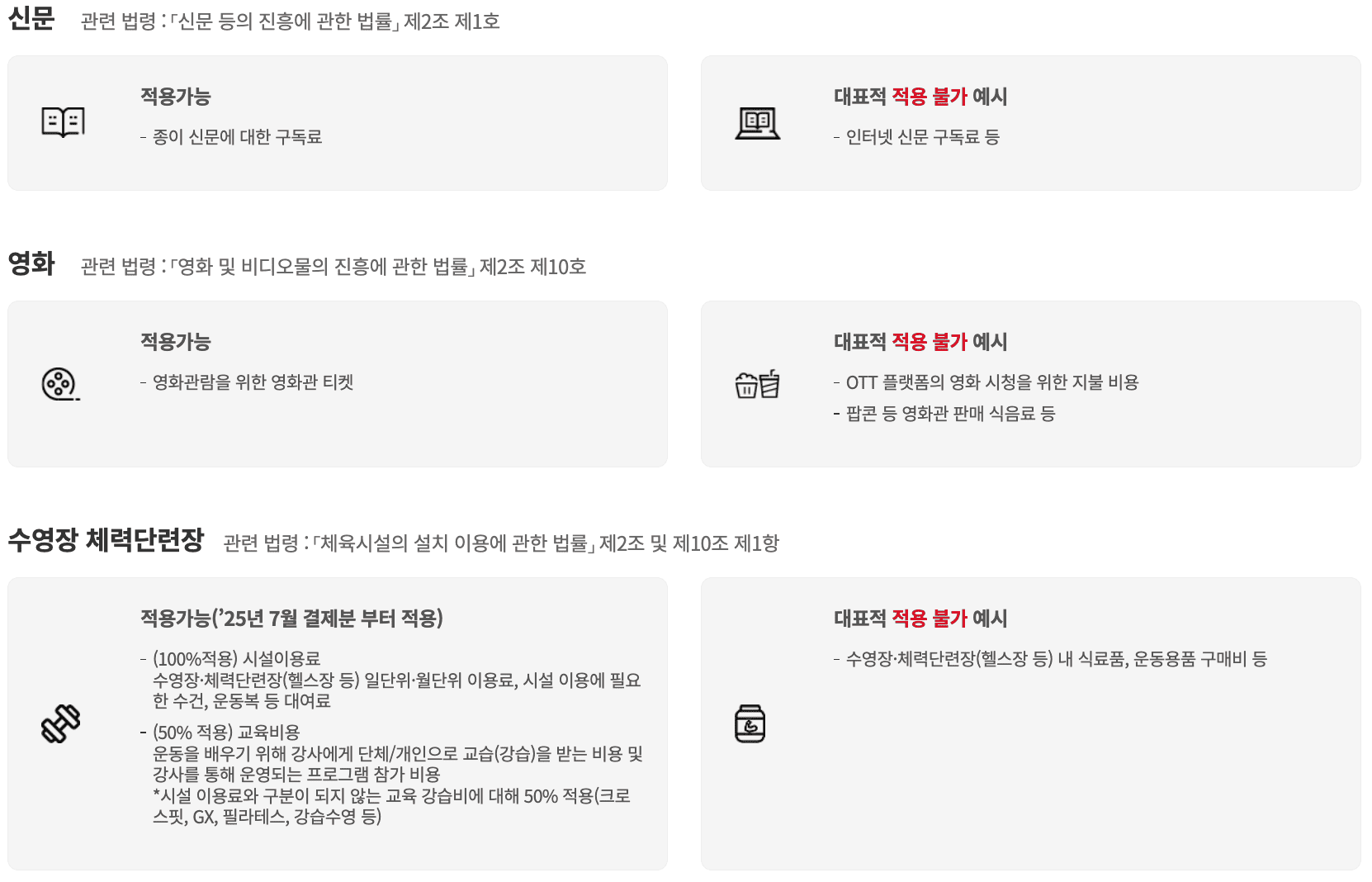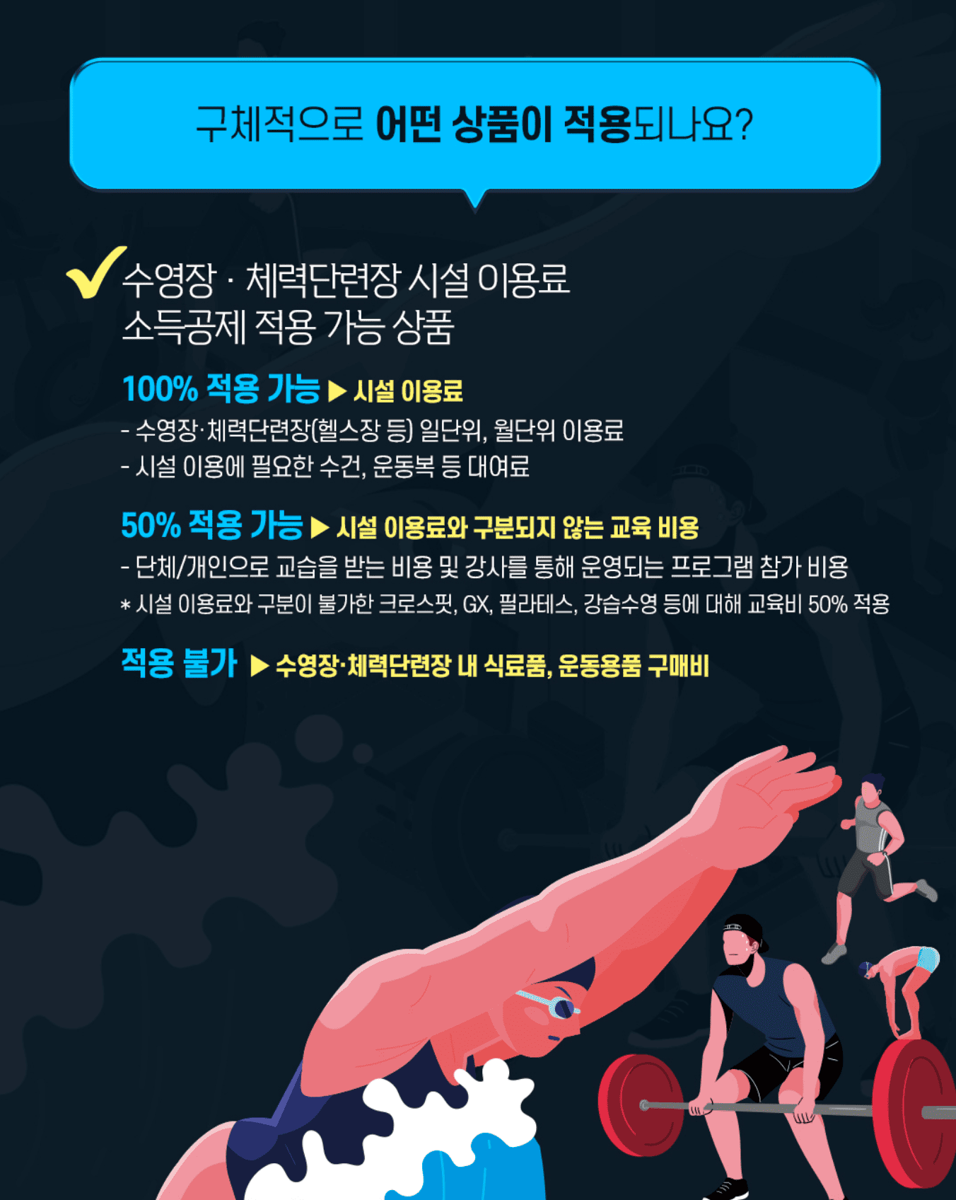2025년 7월 1일부터 수영장, 헬스장 등 체육시설 이용료가 공제 대상에 포함됩니다.