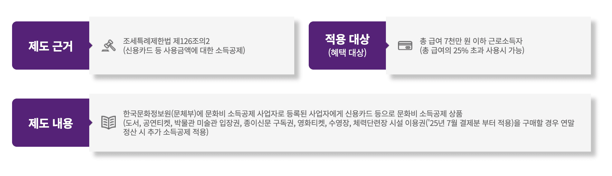 | 적용 조건 | 총 사용액이 급여의 25% 초과 시 초과분 중 문화비 공제 가능 |