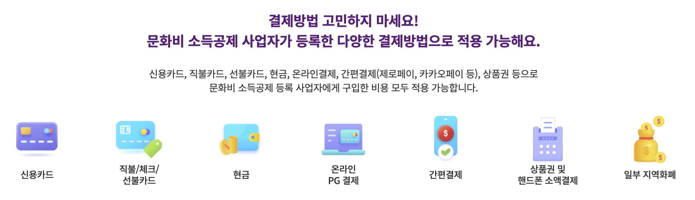| 사용 방법 | 신용카드, 체크카드, 현금영수증 (※ 간편결제는 ‘연동 카드’일 때만 인정) |