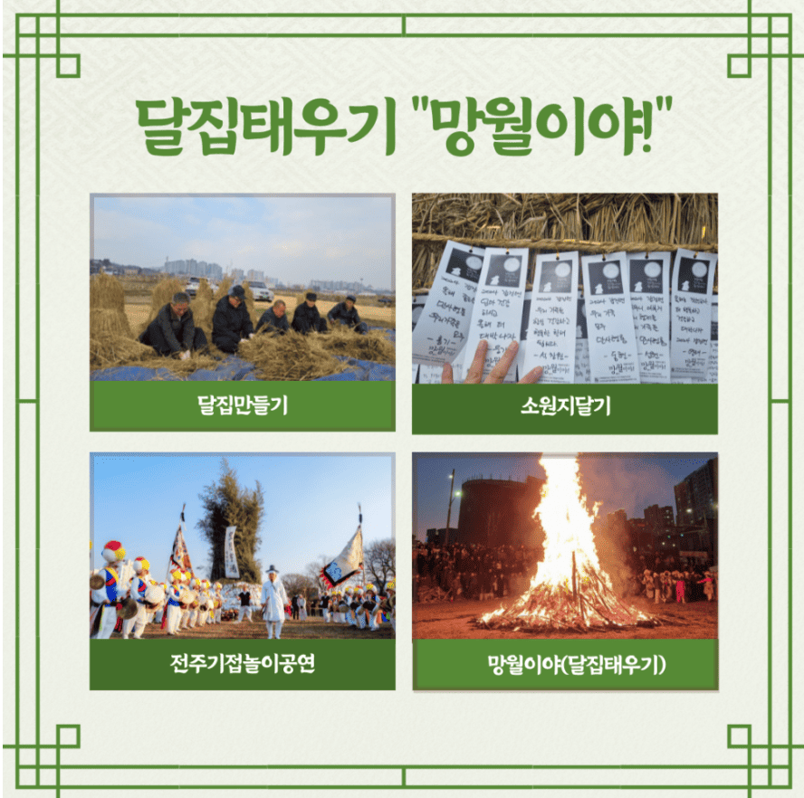 - 주요 행사: 달집태우기, 쥐불놀이, 전통놀이 체험, 민속공연