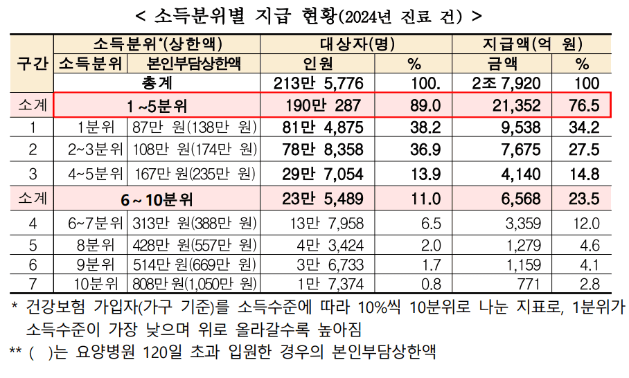 - 소득 하위 1분위자는 89만 원, 소득 상위 10분위자는 826만 원(요양병원 장기입원 시 최대 1,074만 원)