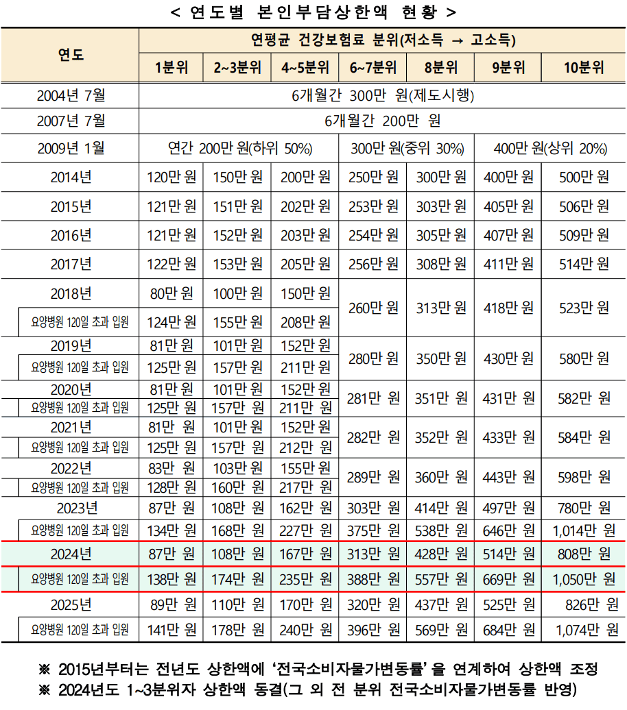- 2025년 기준 본인부담상한액: 소득 수준에 따라 89만 원 ~ 1,050만 원