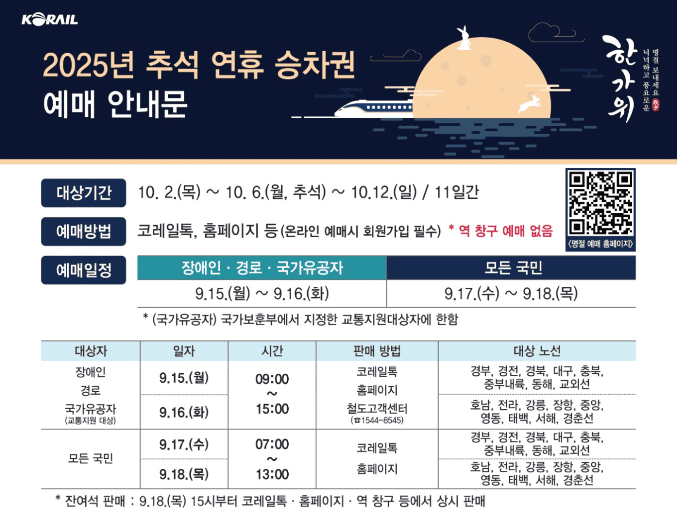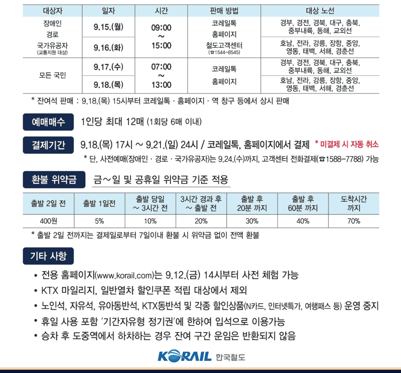 - 잔여석 판매: 9월 18일(목) 15시부터 코레일톡·홈페이지·역 창구에서 동시 진행