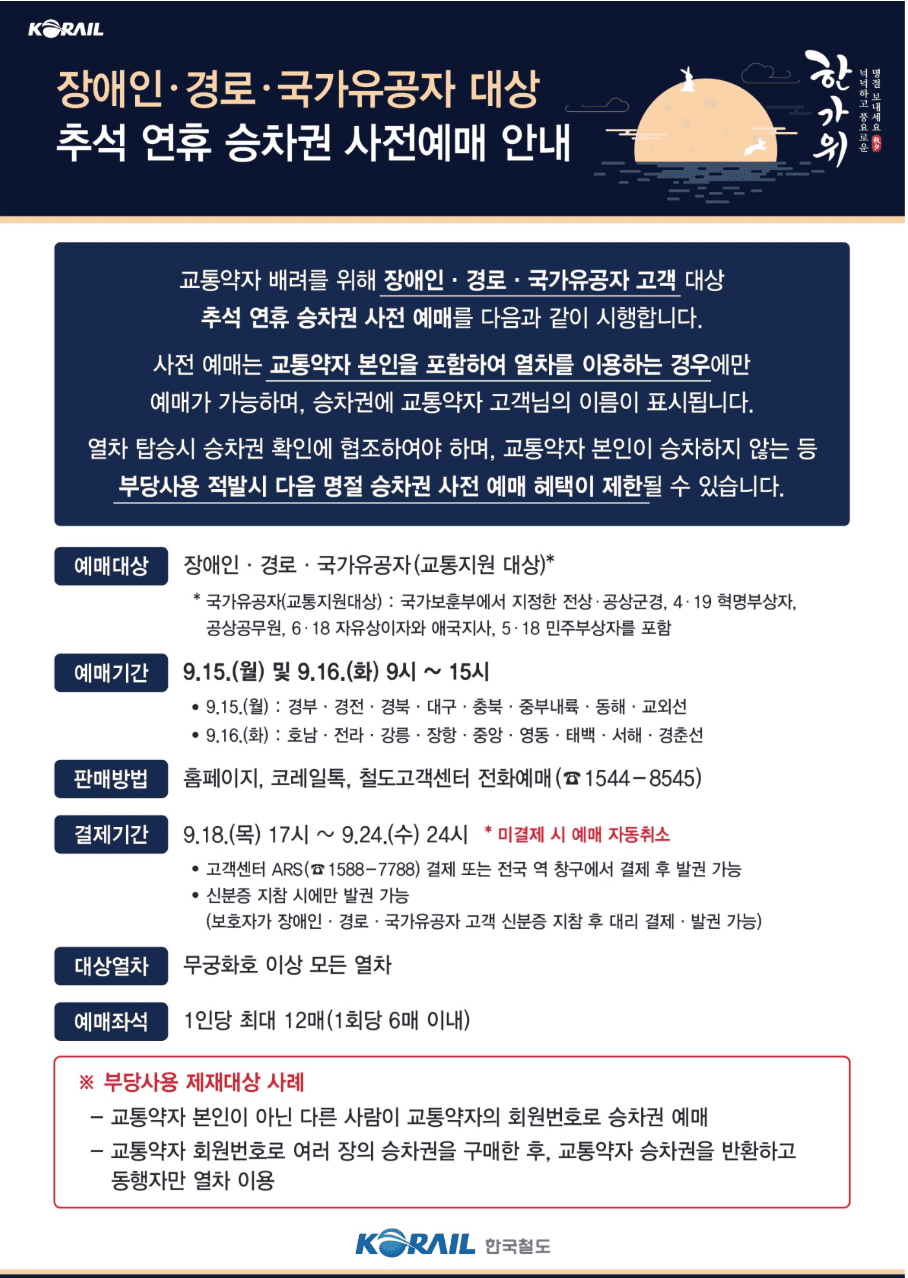 👉 교통약자 본인이 반드시 포함된 승차권만 예매 가능하며, 본인이 승차하지 않을 경우 다음 명절 예매 혜택에서 제외될 수 있습니다.
