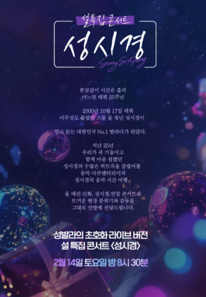 | SBS | 2/14(토) | 오후 8:30 | 설 특집 콘서트 성시경 | 설 연휴 첫날 저녁 프라임타임 콘서트 특집 편성 확정 |